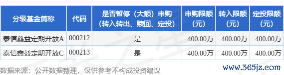 本站讯息开yun体育网,8月8日泰信基金科罚有限公司发布《泰信鑫益如期通达债券型证券投资基金暂停大额申购、大额颐养转入、如期定额投资业务公告》。公告中教导,为保证本基金的踏实运作,保护基金份额抓有东谈主利益,自2025年8月12日起泰信鑫益如期通达债券型证券投资基金暂停大额申购、大额颐养转入、如期定额投资业务,申购、颐养转入上限金额为400.0万元,下属分级基金调整明细如下: