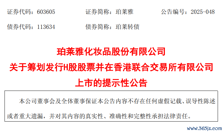 2025年8月27日,上交所主板上市公司珀莱雅(603605.SH)发布了《对于缱绻刊行H股股票并在香港皆集交往所有这个词限公司上市的指示性公告》(详见后文)。公告涌现,为加速公司的国际化计谋和国外业务发展,增强公司的境外融资能力,进一步提升公司的笼统竞争力,凭证公司总体发展计谋及运营需要,公司拟刊行境外上市股份(H股)并在香港皆集交往所有这个词限公司主板挂牌上市。