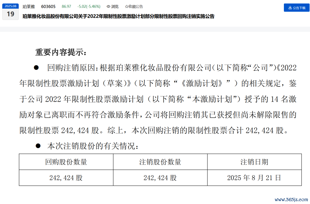 不外,王莉女士所抓部分股份可能已被回购刊出。该公司曾于2025年8月19日发布《对于2022年适度性股票激发方针部分适度性股票回购刊出引申公告》。公告涌现,鉴于公司2022年适度性股票激发方针(以下简称“本激发方针”)授予的14名激发对象已下野而不再顺应激发条目,公司将回购刊出其已获授但尚未撤消限售的适度性股票242,424股。