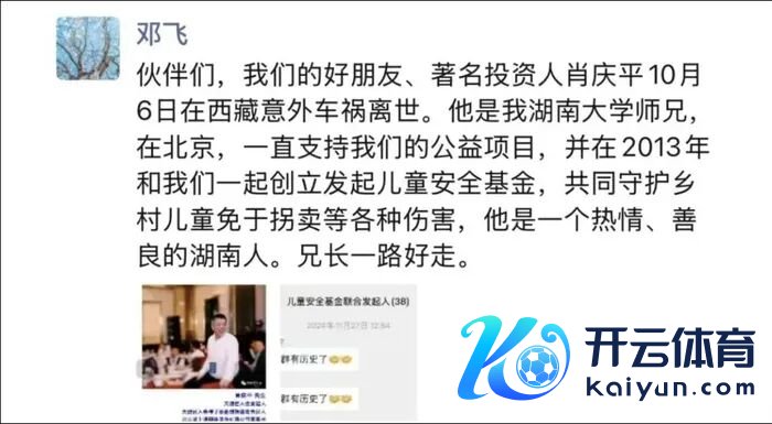 10月7日开云体育,资深公益东说念主邓飞一又友圈发文丧祭:有名投资东说念主肖庆平10月6日在西藏有时车祸离世。